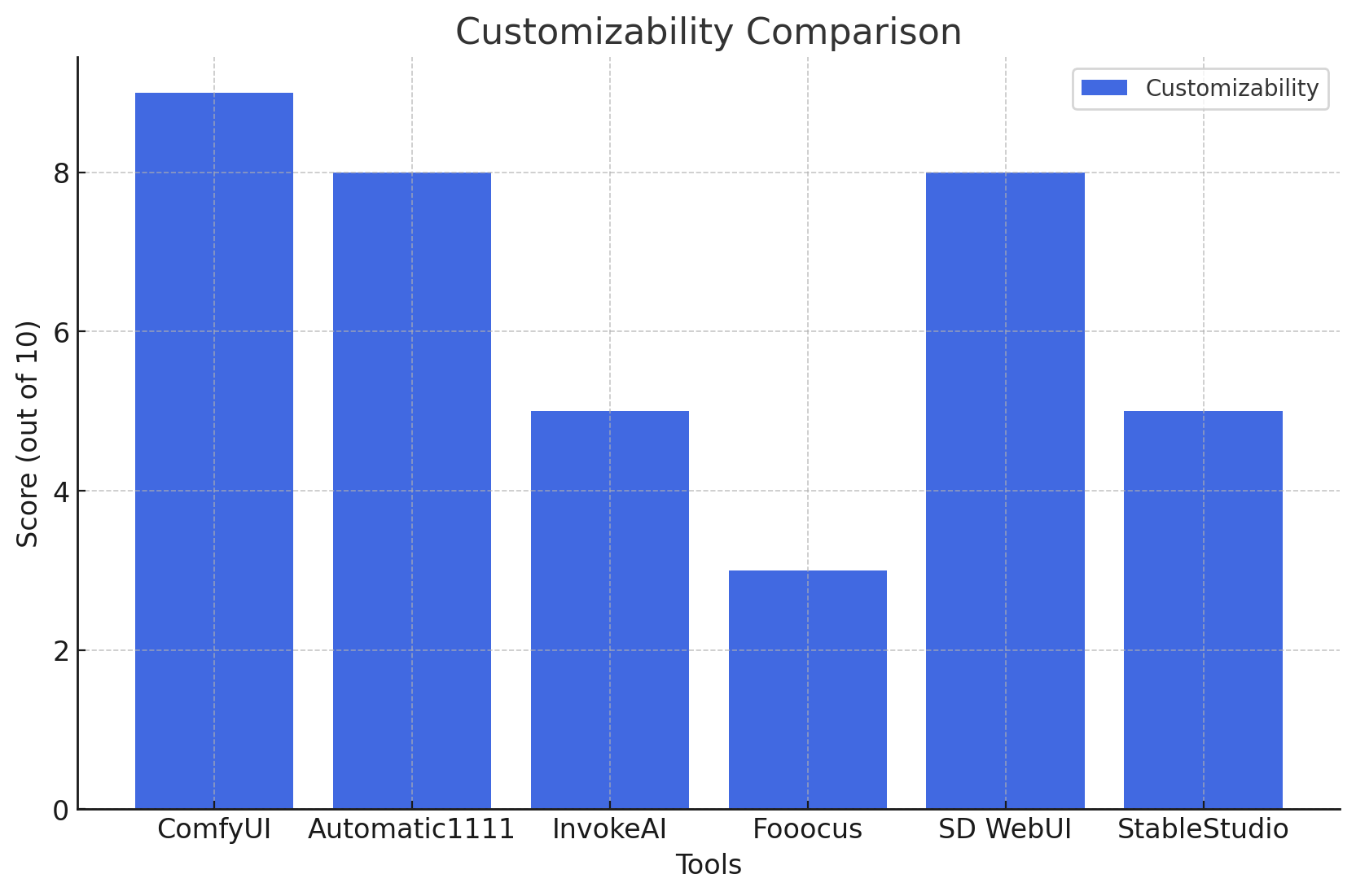 ComfyUI در کنار سایر ابزارهای محبوبی مانند Automatic1111، InvokeAI، Fooocus، Stable Diffusion WebUI و StableStudio رقابت می‌کند. Automatic1111 یکی از محبوب‌ترین جایگزین‌هاست که دارای رابط گرافیکی کلاسیک و پلاگین‌های متعدد است، اما نسبت به ComfyUI انعطاف‌پذیری کمتری دارد. InvokeAI و Fooocus گزینه‌های ساده‌تری هستند که برای کاربران مبتدی مناسب‌ترند، اما امکانات کمتری برای سفارشی‌سازی دارند. StableStudio نیز یک رابط کاربری مدرن با قابلیت‌های محدودتر است. انتخاب بهترین گزینه به میزان کنترل موردنیاز، سادگی استفاده و سرعت پردازش بستگی دارد.