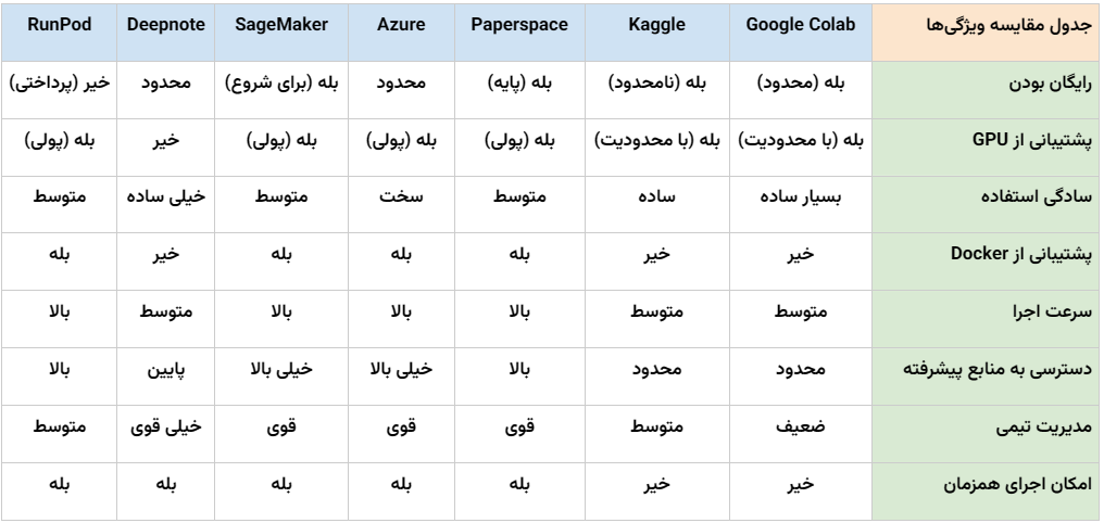 با وجود محبوبیت بالای Google Colab، رقبای متعددی مانند Kaggle Notebooks، Paperspace Gradient، Azure Notebooks، AWS SageMaker، Deepnote و JupyterHub نیز در این حوزه فعالیت دارند. هر یک از این پلتفرم‌ها ویژگی‌های منحصربه‌فردی دارند؛ Kaggle گزینه‌ای رایگان و مشابه با Colab است، Paperspace قدرت پردازشی بالاتر و گزینه‌های GPU حرفه‌ای ارائه می‌دهد، و AWS SageMaker و Azure Notebooks مناسب پروژه‌های مقیاس‌پذیر و تیم‌های تحقیقاتی بزرگ هستند. انتخاب بهترین پلتفرم به عواملی مانند دسترسی به GPU، هزینه، امکانات شخصی‌سازی و مدیریت منابع بستگی دارد.
